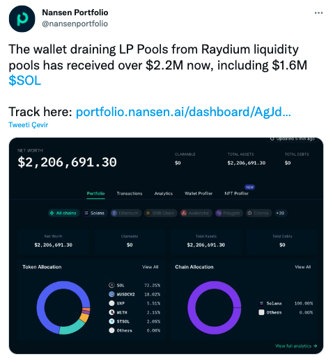 “Raydium likidite havuzlarından LP Havuzlarını boşaltan cüzdan, şu anda 1,6 Milyon Dolar $SOL dahil olmak üzere 2,2 Milyon Doların üzerinde para aldı.”