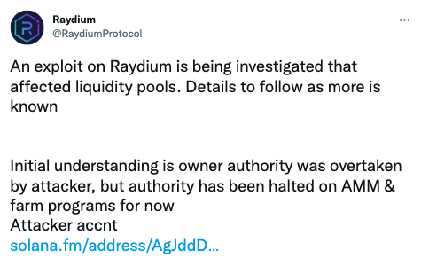 Solana blok zincirinin önemli merkeziyetsiz finans ve ticaret platformlarından biri olan Raydium hacklendi. Saldırganların, likidite havuzlarından birini boşalttıkları ve 2.2 milyon zarara uğradıkları belirtildi.
